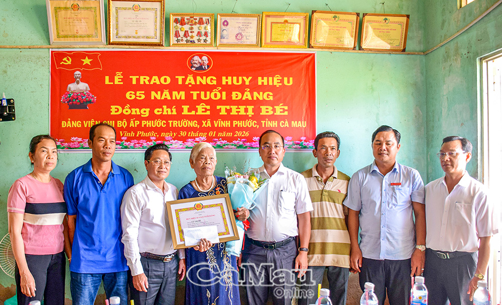 Hướng tới kỷ niệm 96 năm Ngày thành lập Đảng Cộng sản Việt Nam (3/2/1930-3/2/2026), sáng 30/1, đồng chí Bùi Tấn Bảy, Uỷ viên Ban Thường vụ Tỉnh uỷ, Phó Chủ tịch HĐND tỉnh Cà Mau, đến trao Huy hiệu 65 năm tuổi Đảng cho đảng viên lão thành tại xã Vĩnh Phước.