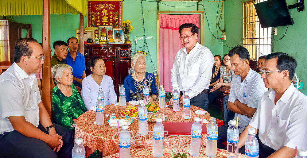 Phó Chủ tịch HĐND tỉnh Bùi Tấn Bảy cùng các thành viên đoàn công tác, lãnh đạo xã Vĩnh Phước chụp ảnh lưu niệm với đảng viên Lê Thị Bé và gia đình.