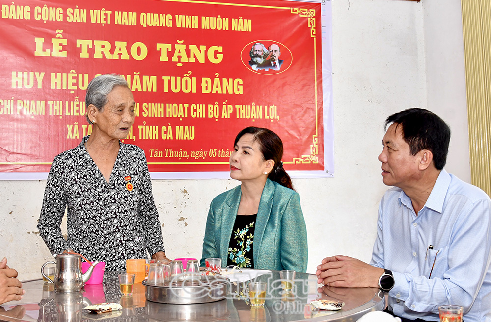 Báo Cà Mau Sáng 5/11, đồng chí Lê Thị Nhung, Uỷ viên Ban Thường vụ Tỉnh uỷ, Phó Chủ tịch Thường trực HĐND tỉnh, đã đến trao Huy hiệu 65 năm tuổi Đảng cho đồng chí Phạm Thị Liễu, đảng viên Chi bộ ấp Thuận Lợi, xã Tân Thuận.