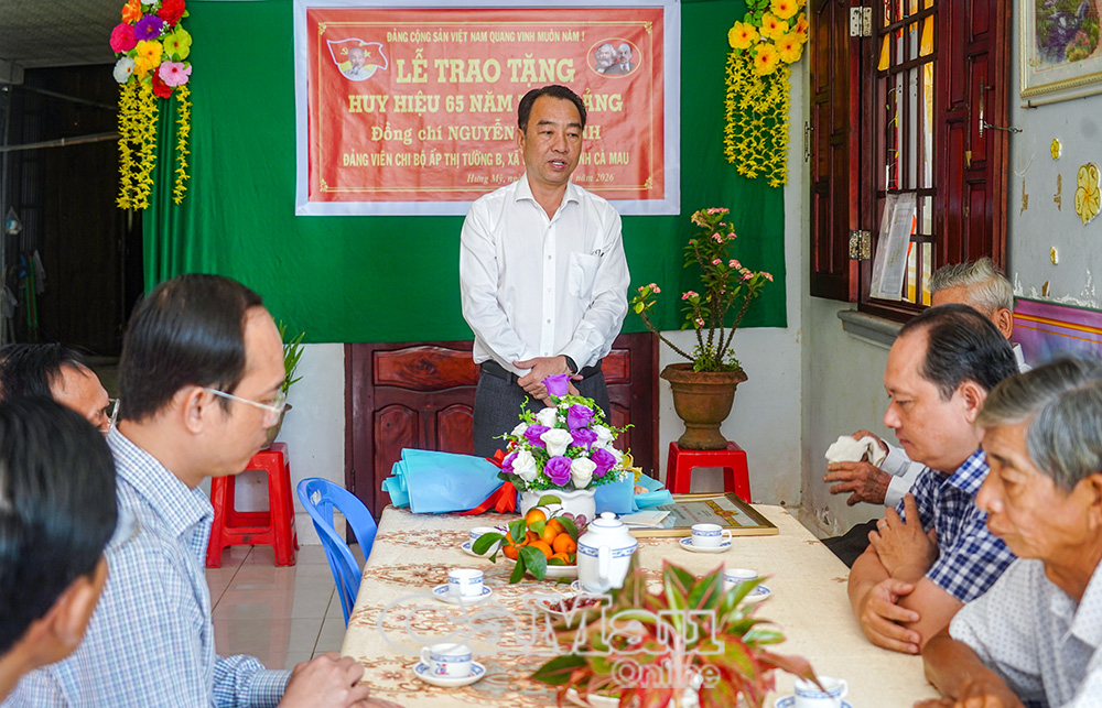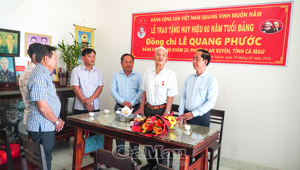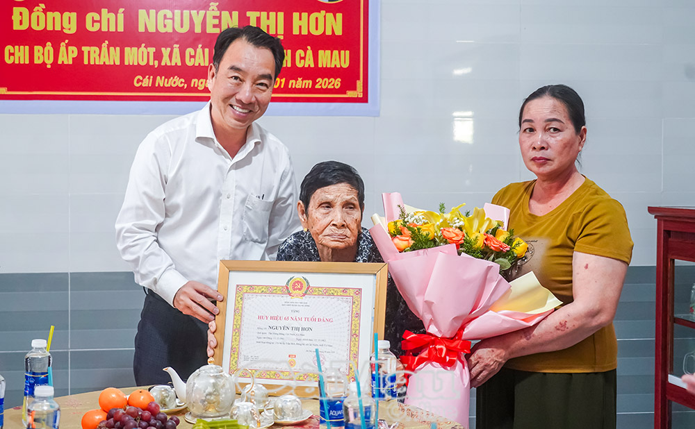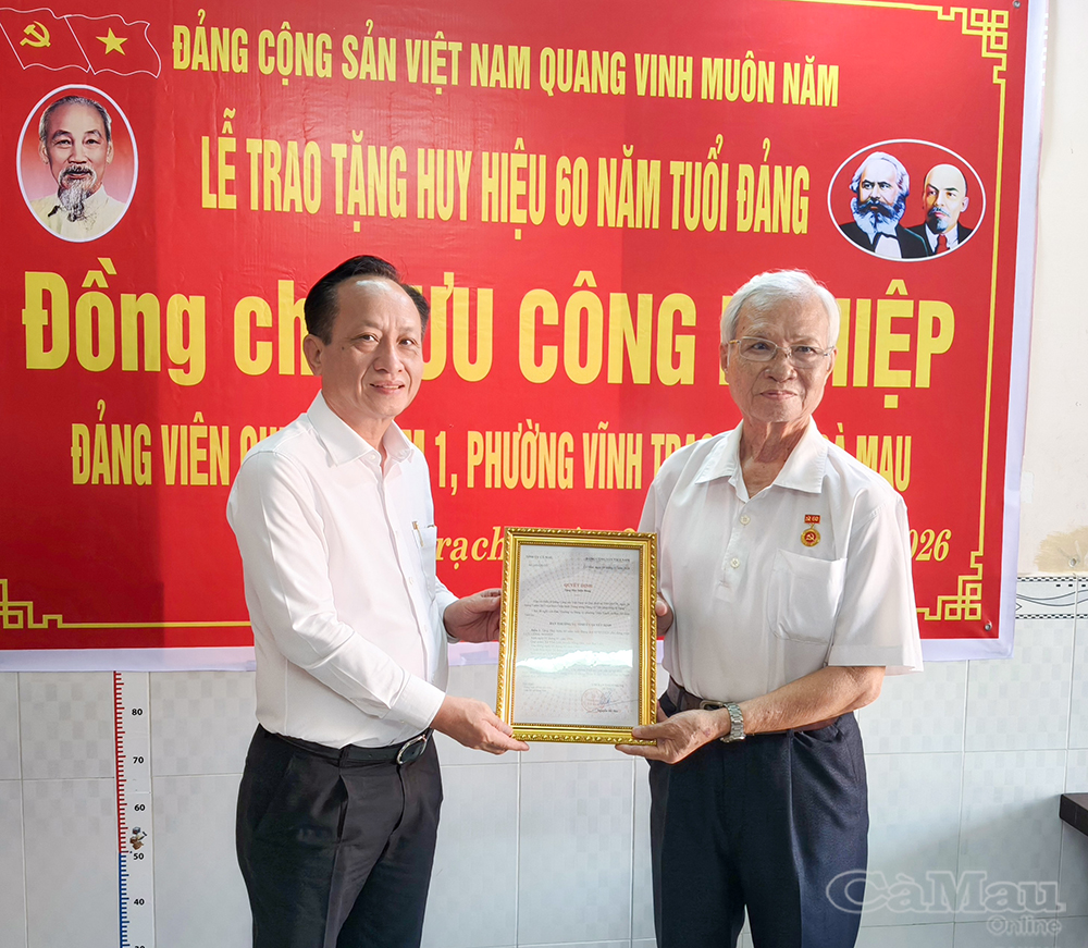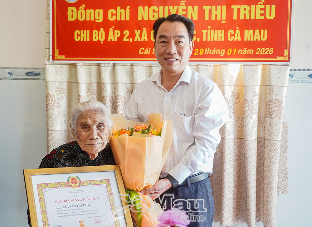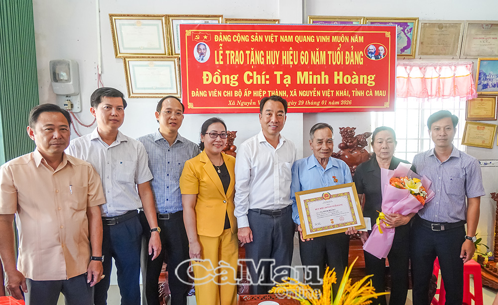 Báo Cà Mau Nhân kỷ niệm 96 năm Ngày thành lập Đảng Cộng sản Việt Nam (3/2/1930-3/2/2026), Thường trực Tỉnh uỷ Cà Mau tổ chức các đoàn đến trao Huy hiệu 60 năm, 65 năm tuổi Đảng cho các đảng viên lão thành cách mạng tại nhiều địa phương trên địa bàn tỉnh. Đây là sự ghi nhận, tri ân sâu sắc của Đảng đối với những cống hiến bền bỉ, kiên trung của các đảng viên trong suốt quá trình phấn đấu vì sự nghiệp cách mạng của Đảng và dân tộc.