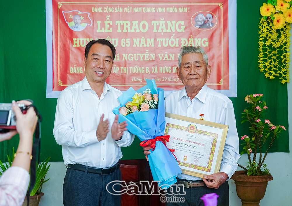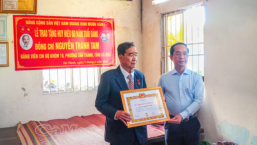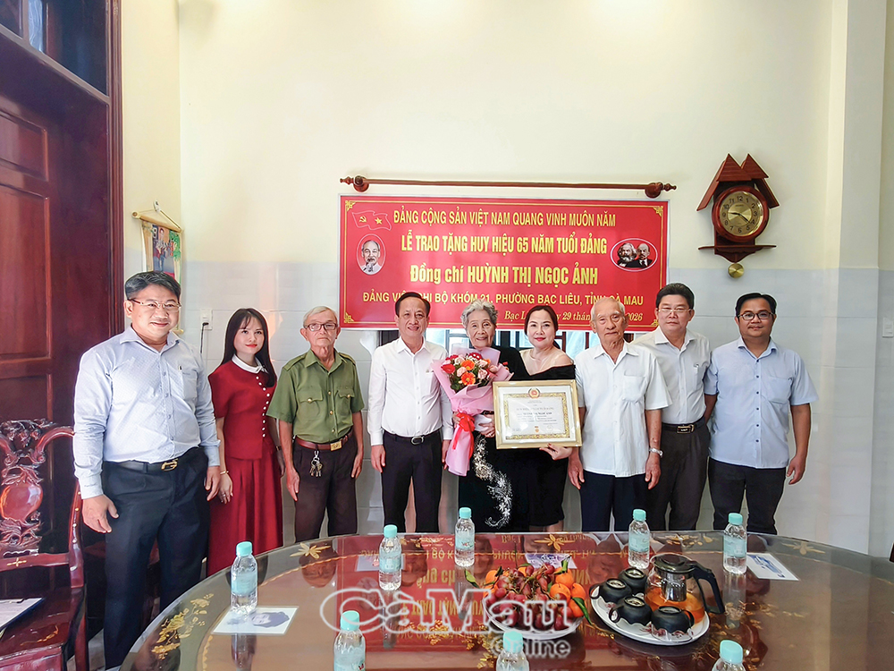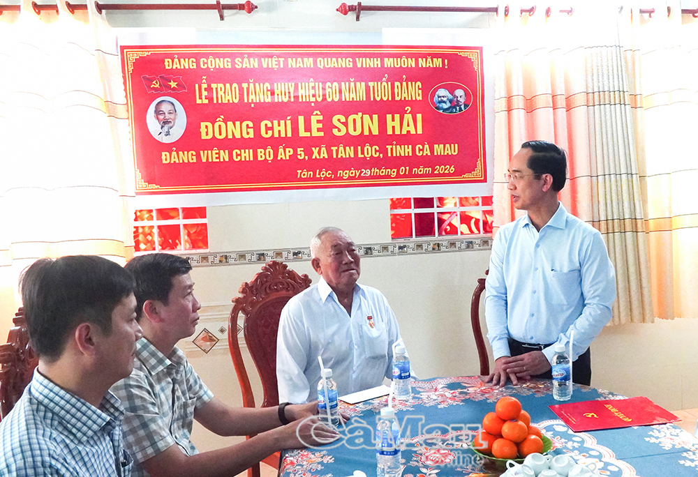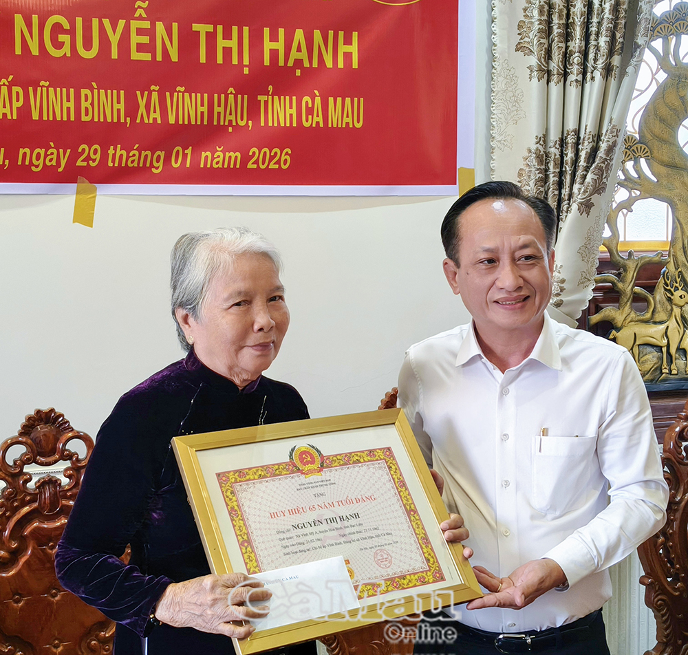 Báo Cà Mau Nhân kỷ niệm 96 năm Ngày thành lập Đảng Cộng sản Việt Nam (3/2/1930-3/2/2026), Thường trực Tỉnh uỷ Cà Mau tổ chức các đoàn đến trao Huy hiệu 60 năm, 65 năm tuổi Đảng cho các đảng viên lão thành cách mạng tại nhiều địa phương trên địa bàn tỉnh. Đây là sự ghi nhận, tri ân sâu sắc của Đảng đối với những cống hiến bền bỉ, kiên trung của các đảng viên trong suốt quá trình phấn đấu vì sự nghiệp cách mạng của Đảng và dân tộc.