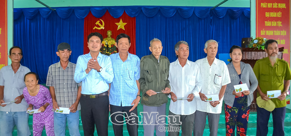Ông Nguyễn Văn Khởi (bìa trái), Phó Chủ tịch Uỷ ban MTTQ Việt Nam tỉnh Cà Mau cùng ông Trần Quốc Cường, Phó Trưởng ban Liên lạc trao quà cho người dân.