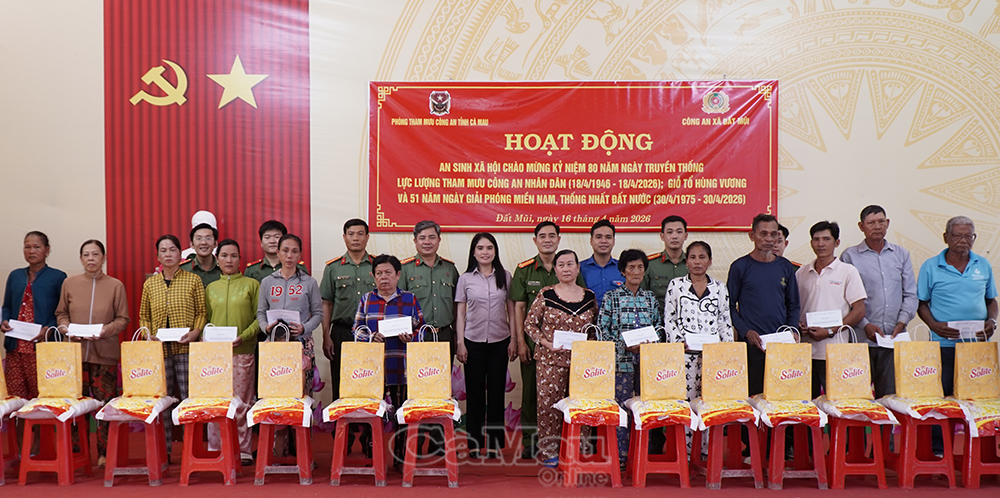 Báo Cà Mau Sáng 16/4, Phòng Tham mưu (Công an tỉnh Cà Mau) phối hợp Công an xã Đất Mũi tổ chức chương trình tặng quà cho các gia đình chính sách và hộ khó khăn trên địa bàn.