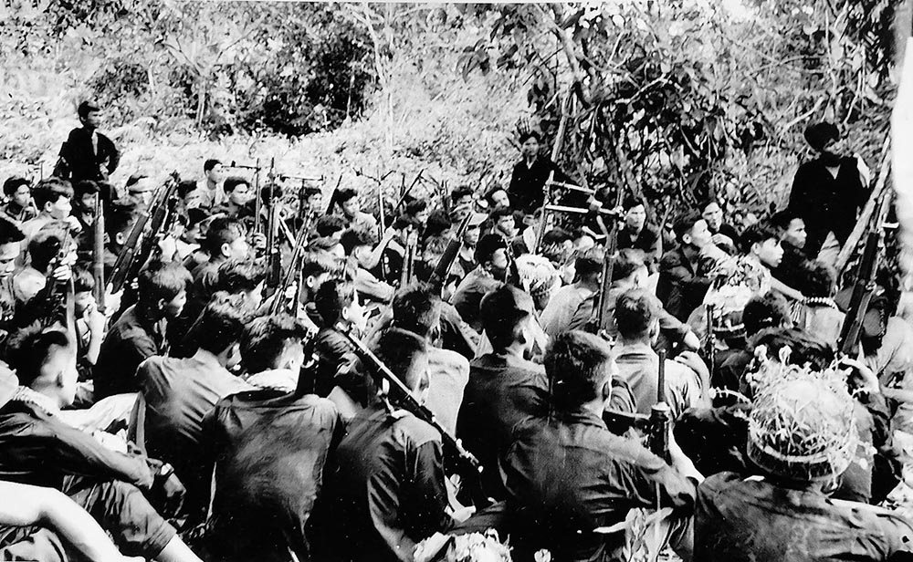 Ngày 7/9/1963, Tiểu đoàn U Minh 1 đang học tập và trao đổi phương án tác chiến trên sa bàn Chi khu Ðầm Dơi. (Ảnh tư liệu)