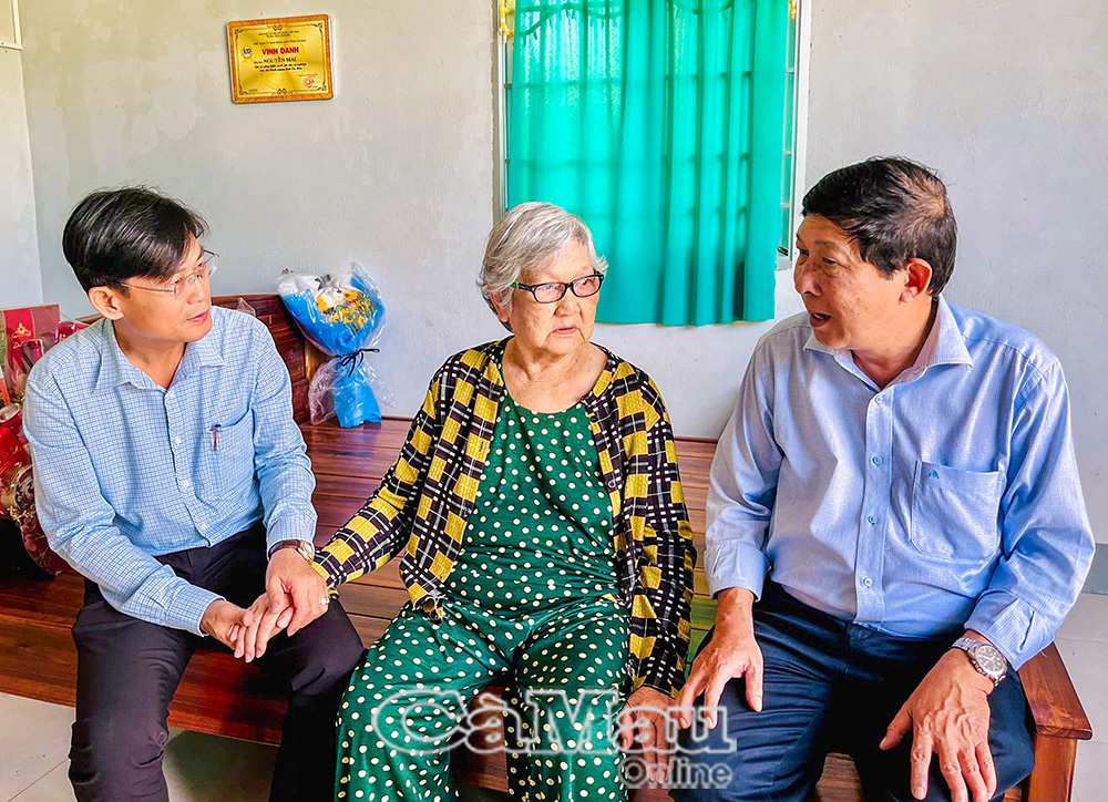Nhà báo Nguyễn Thanh Dũng, Chủ tịch Hội Nhà báo tỉnh và Nhà báo Nguyễn Quốc Danh, Phó Giám đốc Báo và phát thanh, truyền hình Cà Mau, thăm hỏi sức khoẻ bà Nguyễn Thị Be, vợ Nhà báo - Liệt sĩ Nguyễn Mai.