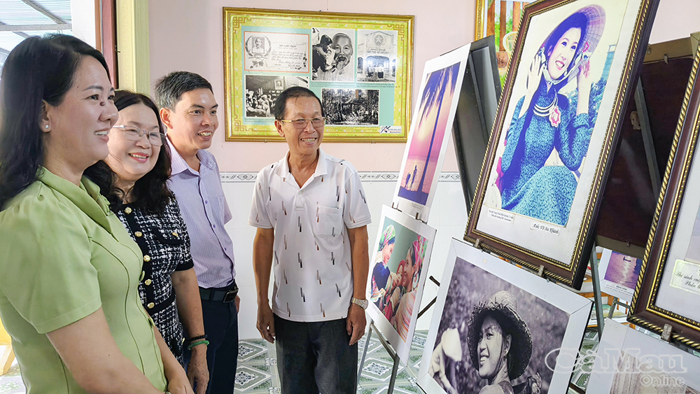 Nhà báo Nguyễn Thị Lâm Anh, Phó Giám đốc Báo và PT,TH Cà Mau (bìa trái) và đoàn thăm quan nhà truyền thống trưng bày các tác phẩm nhiếp ảnh và tưởng nhớ cố Nhà báo - Nghệ sĩ Nhiếp ảnh Võ An Khánh, nguyên Tổng Biên tập Báo ảnh Đất Mũi.