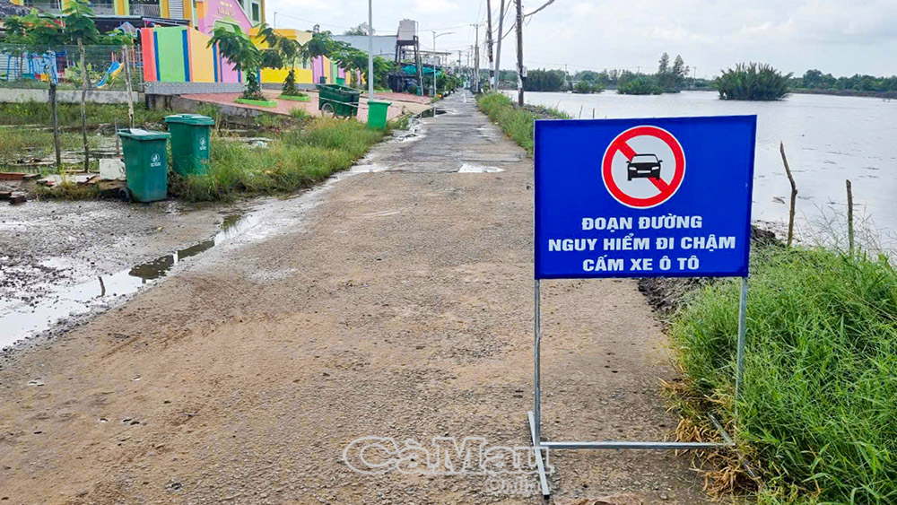 Nhiều tuyến đường giao thông khi triều cường rút đã bị sụp lún đất, nhiều đoạn lộ bê tông bị hư hỏng. (Ảnh chụp lộ bê tông thuộc ấp Tân Tiến).