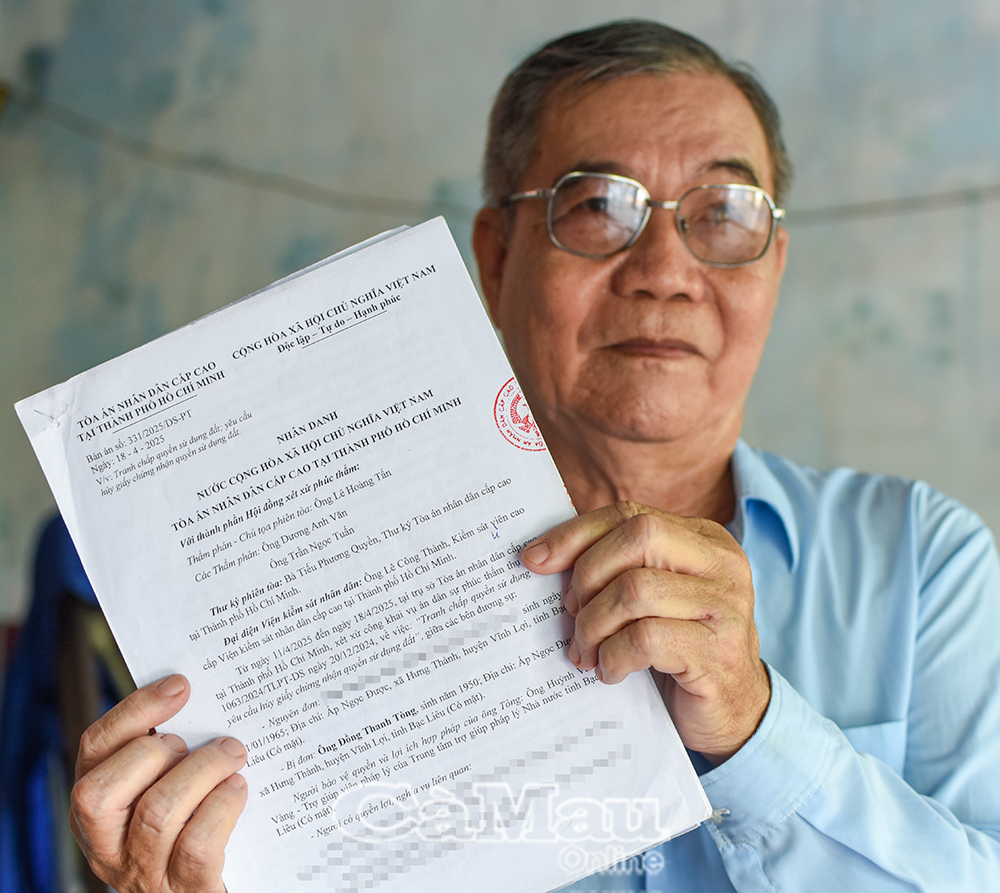 Cầm trên tay bản án phúc thẩm của Toà án nhân dân cấp cao tại TP Hồ Chí Minh, ông Đồng Thanh Tòng ( xã Hưng Hội) không giấu được vui mừng khi kết quả như ý nguyện.