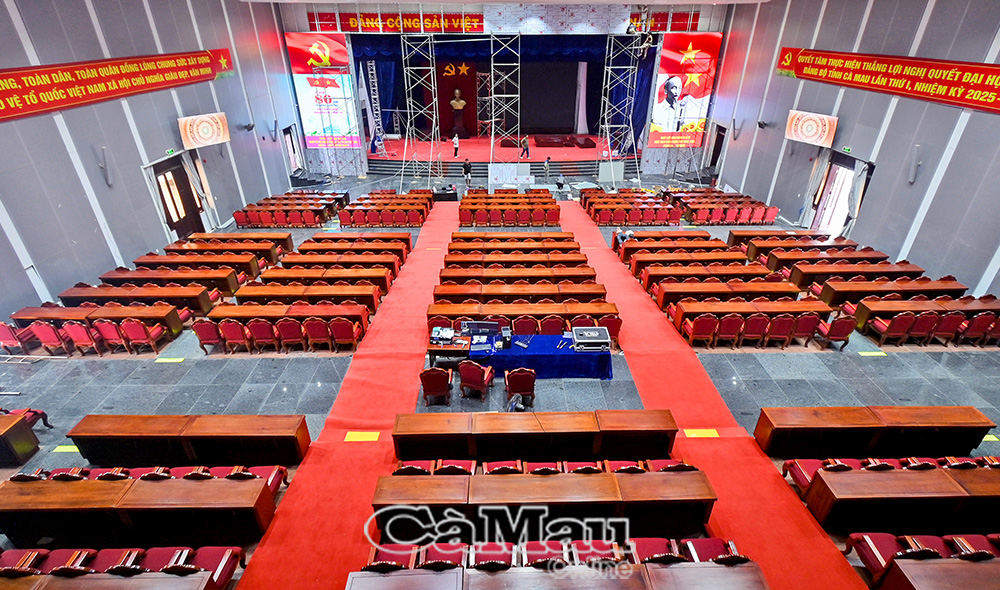 Các hoạt động tranh trí, khánh tiết tại Trung tâm Hội nghị đang được các đơn vị thực hiện, chuẩn bị cho Đại hội đại biểu Đảng bộ tỉnh Cà Mau lần thứ I, nhiệm kỳ 2025-2030.