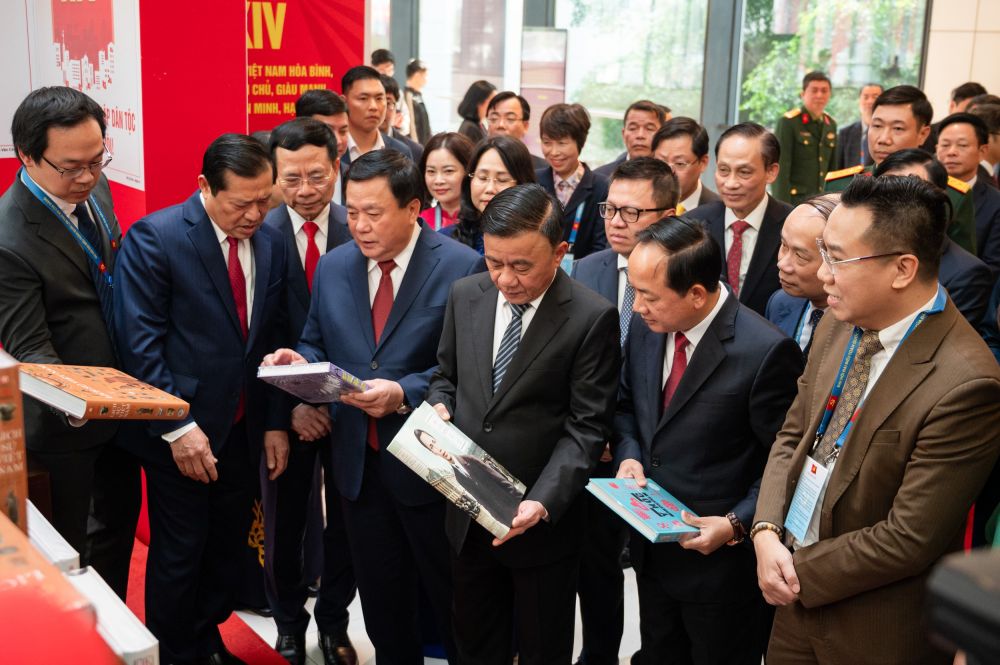 Uỷ viên Bộ Chính trị, Thường trực Ban Bí thư Trần Cẩm Tú; Uỷ viên Bộ Chính trị, Giám đốc Học viện Chính trị quốc gia Hồ Chí Minh, Chủ tịch Hội đồng Lý luận Trung ương Nguyễn Xuân Thắng; Bí thư Trung ương Đảng, Trưởng Ban Tuyên giáo và Dân vận Trung ương Trịnh Văn Quyết và lãnh đạo các ban, bộ, ngành tham quan Gian trưng bày sách, báo chào mừng Đại hội XIV của Đảng do Bộ Văn hoá, Thể thao và Du lịch thực hiện. Ảnh: Phạm Thắng