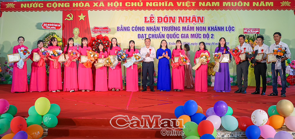 Đồng chí Nguyễn Thế Châu, Bí thư Đảng uỷ, Chủ tịch HĐND xã, và đồng chí Phan Kim Bía, Chủ tịch UBND xã Trần Văn Thời trao bằng khen cho các tập thể và cá nhân có thành tích tiêu biểu trong quá trình xây dựng Trường Mầm non Khánh Lộc đạt chuẩn Quốc gia mức độ 2.