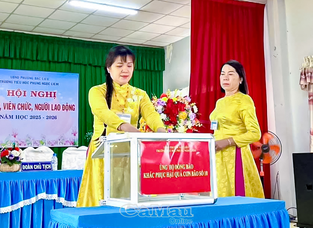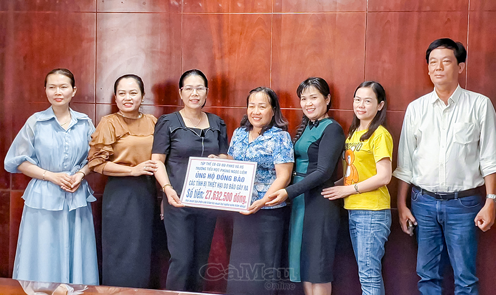 Ban Giám hiệu Trường Tiểu học Phùng Ngọc Liêm trao ủng hộ đồng bào miền Bắc bị thiệt hại do bão số 10 cho Uỷ ban MTTQ Việt Nam phường Bạc Liêu.