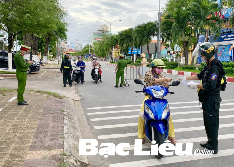 Lực lượng làm nhiệm vụ kiểm tra giấy đi đường của người dân trên tuyến đường Trần Phú (TP. Bạc Liêu). Ảnh: H.L