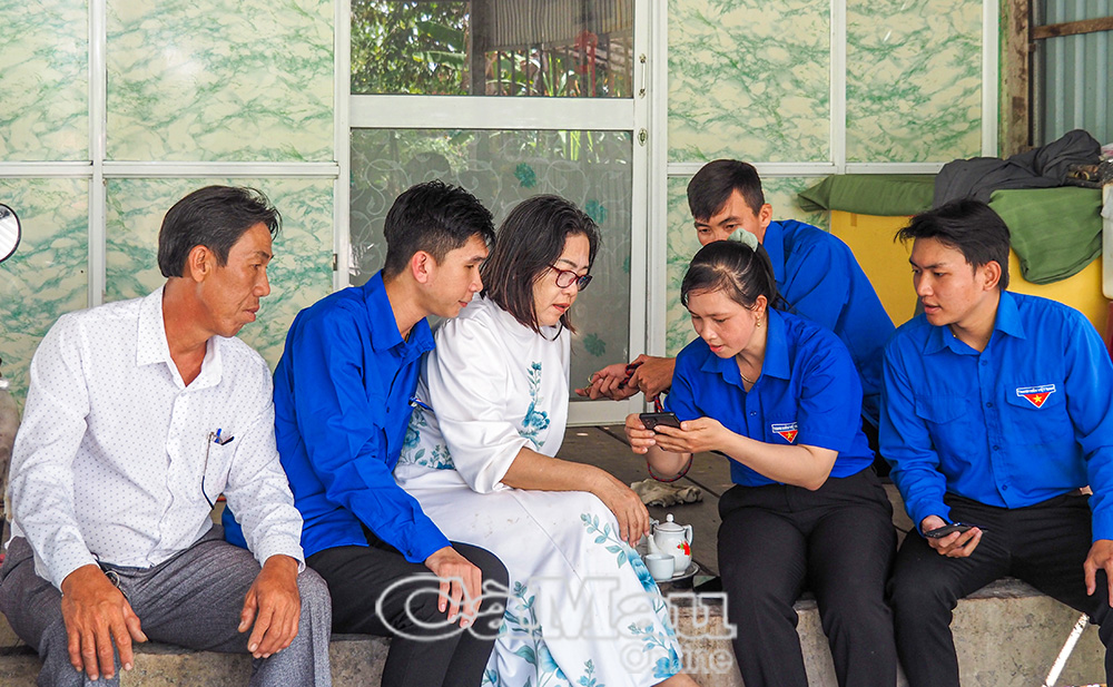 Cán bộ, đoàn viên, thanh niên xã Tân Thuận hỗ trợ người dân tiếp cận công nghệ, sử dụng thanh toán không tiền mặt và cài đặt các ứng dụng số.