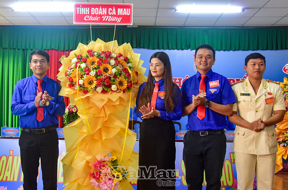 Đồng chí Trần Đăng Khoa, Phó Bí thư Thường trực Tỉnh đoàn Cà Mau (bìa trái), tặng hoa chúc mừng đại hội.