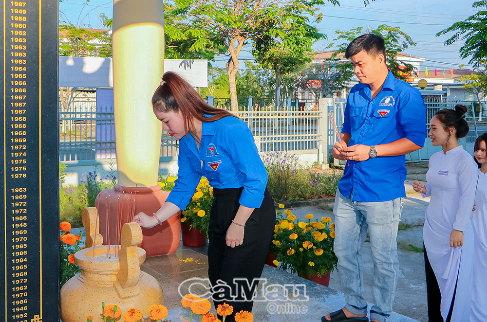 Đoàn viên, thanh niên thắp hương tại Bia ghi danh các Anh hùng liệt sĩ (xã Vĩnh Lợi).