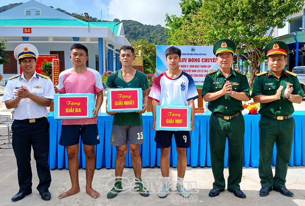 Lãnh đạo các đơn vị trên đảo Hòn Khoai trao thưởng các đội đạt giải giao lưu bóng chuyền.