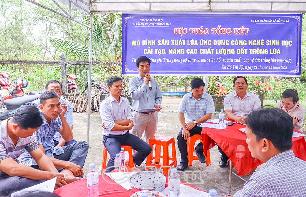 Báo Cà Mau Sáng 24/12, Chi cục Trồng trọt và Bảo vệ thực vật Cà Mau (Sở Nông nghiệp và Môi trường) phối hợp với UBND Xã Hồ Thị Kỷ tổ chức hội nghị tổng kết mô hình sản xuất lúa ứng dụng công nghệ sinh học nhằm cải tạo, nâng cao chất lượng đất trồng lúa.