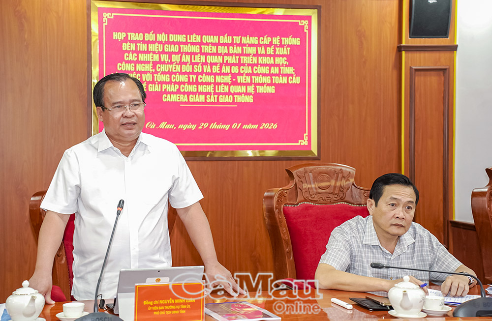 Báo Cà Mau Ngày 29/1, UBND tỉnh và Công an tỉnh có buổi làm việc với Tổng Công ty Công nghệ - Viễn thông toàn cầu (GTel) nhằm trao đổi, thống nhất chủ trương đầu tư, nâng cấp hệ thống đèn tín hiệu giao thông trên địa bàn tỉnh; nghiên cứu các giải pháp công nghệ phục vụ camera giám sát, xử lý vi phạm, điều hành giao thông.