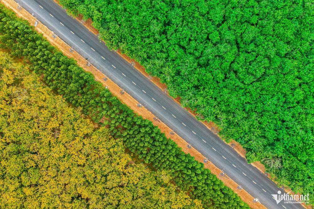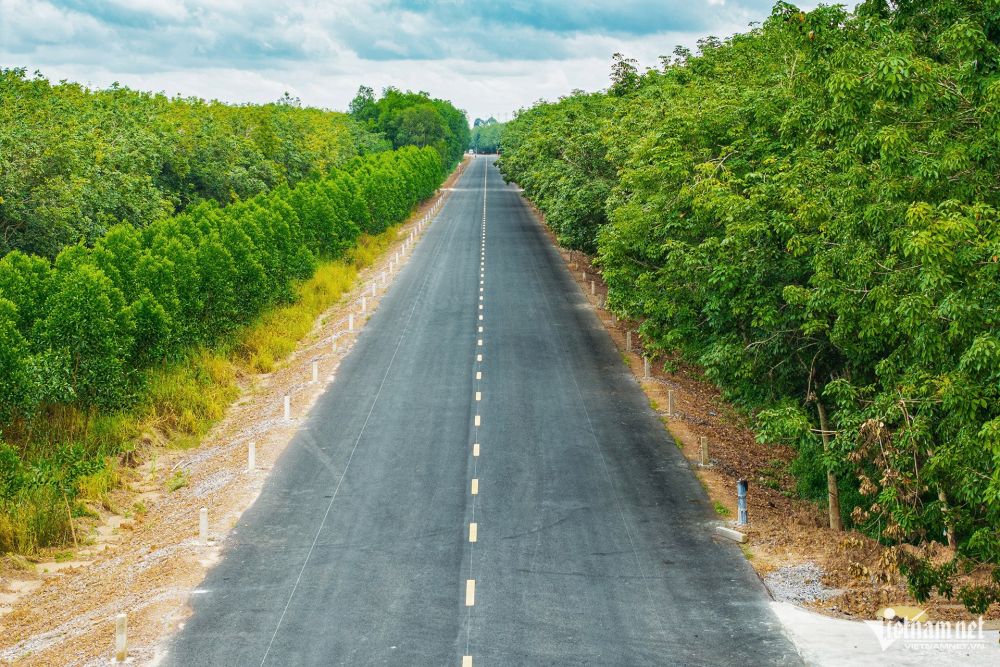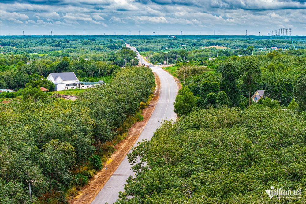 Nhìn từ trên cao, tuyến đường nằm giữa cánh đồng cao su bạt ngàn. Nhà thầu đang triển khai các hạng mục sơn vạch kẻ đường, đổ bê tông cọc tiêu…