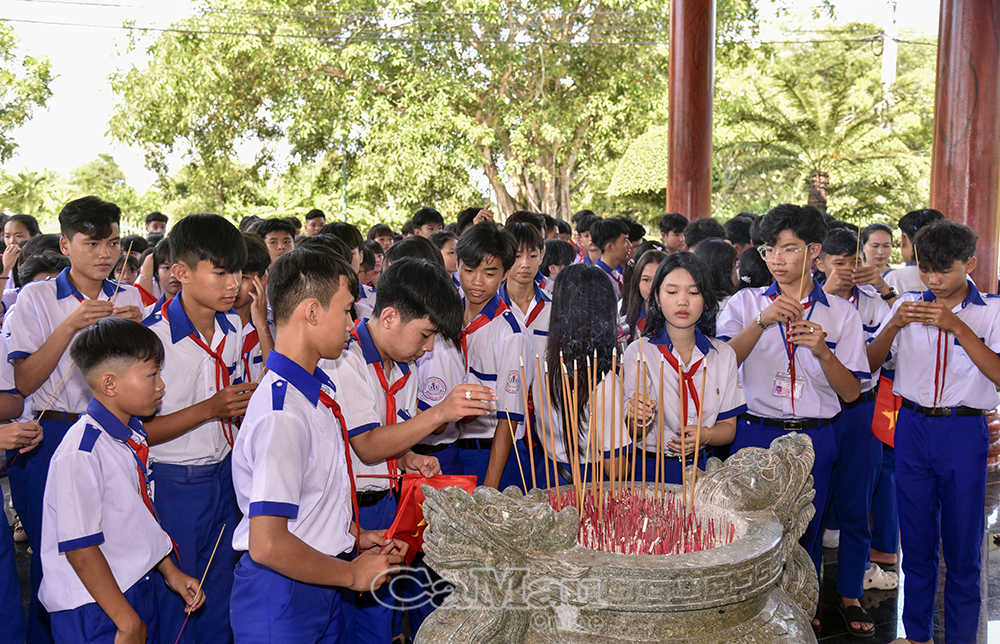 Tại di tích lịch sử quốc gia Đền thờ Chủ tịch Hồ Chí Minh (xã Châu Thới), học sinh được nghe giới thiệu quá trình xây dựng, gìn giữ và bảo vệ ngôi đền trước sự tàn phá của chiến tranh. Trong không khí trang nghiêm, các em đã dâng hương, tưởng niệm, bày tỏ lòng biết ơn sâu sắc đối với công lao to lớn của Bác Hồ và các thế hệ đi trước.