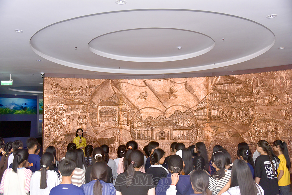 Học sinh được nghe giới thiệu không gian trưng bày lịch sử cách mạng vùng đất Cà Mau. Đặc biệt là mốc son về 2 lần giành chính quyền không đổ máu của Đảng bộ, quân, dân Cà Mau.