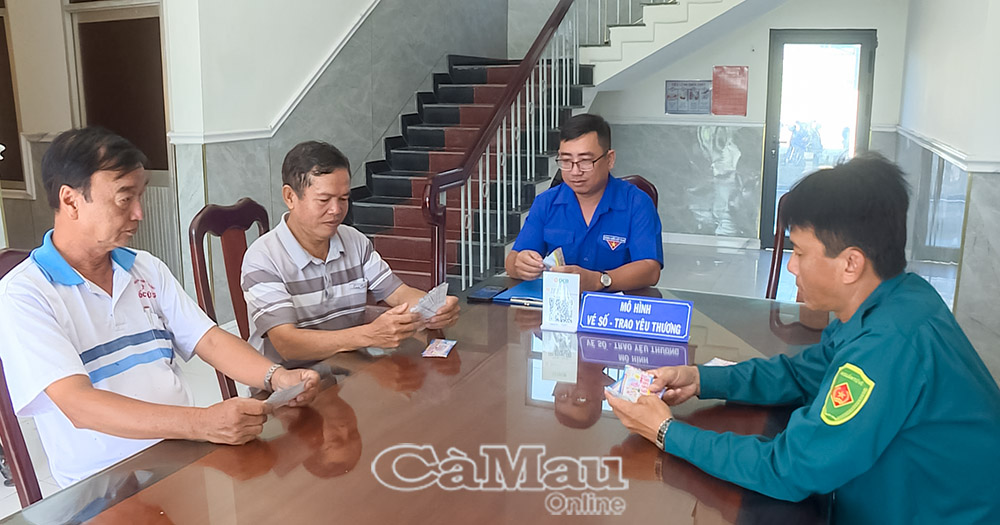 Người dân trên địa bàn đến mua ủng hộ vé số cho hoạt động "Vé số trao yêu thương" của Đoàn Thanh niên xã Phước Long.