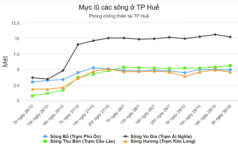 Hệ thống giám sát thiên tai Việt Nam cho biết lúc 6h hôm nay, lũ sông Hương tại Kim Long (Huế) là 3,89 m, trên báo động ba 0,39 m, giảm 1,04 m so với 20h hôm qua. Sông Bồ tại Phú Ốc là 4,48 m, dưới báo động ba 0,02 m, giảm 0,66 m.