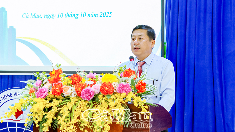 Thầy Huỳnh Minh Hiếu, Phó Hiệu trưởng Trường Cao đẳng Nghề Việt Nam - Hàn Quốc Cà Mau chúc mừng 100 sinh viên hoàn thành chương trình đào tạo và nhận bằng tốt nghiệp.