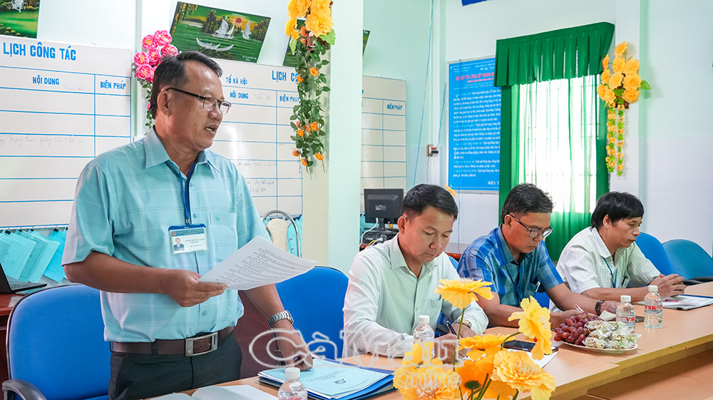 Bí thư Chi bộ Trường THCS Vĩnh Lộc Nguyễn Trường Giang báo cáo kết quả việc thực hiện các nghị quyết quan trọng của Bộ Chính trị.