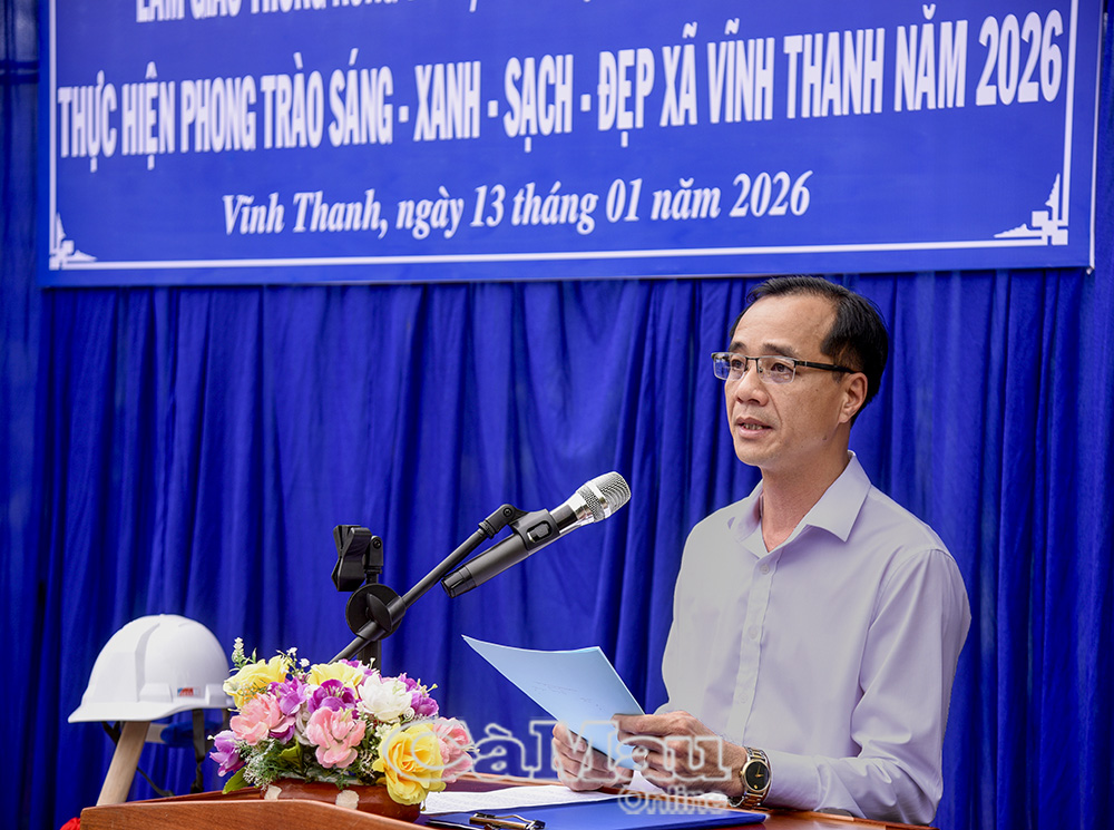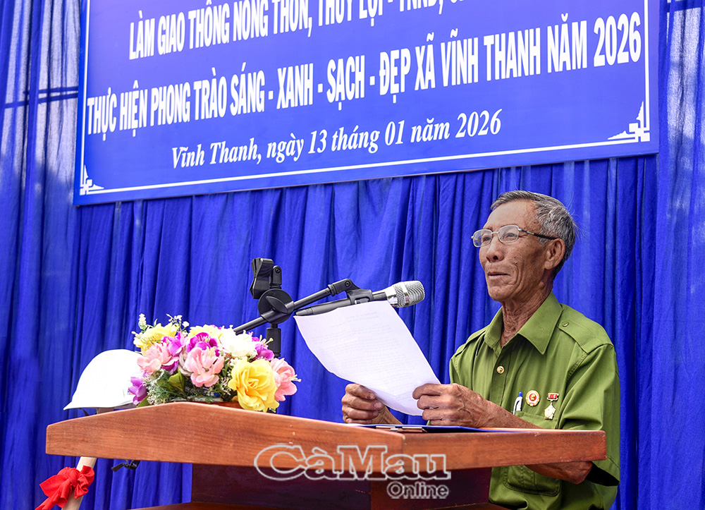 Báo Cà Mau Với mục tiêu xây dựng xã Vĩnh Thanh trở thành nông thôn mới hiện đại, thông minh và đáng sống, sáng 13/1, UBND xã Vĩnh Thanh tổ chức Lễ ra quân làm giao thông nông thôn, thuỷ lợi - thuỷ nông nội đồng, phòng chống sạt lở và thực hiện mô hình “Sáng - xanh - sạch - đẹp”, tạo khí thế thi đua sôi nổi ngay từ đầu năm 2026.
