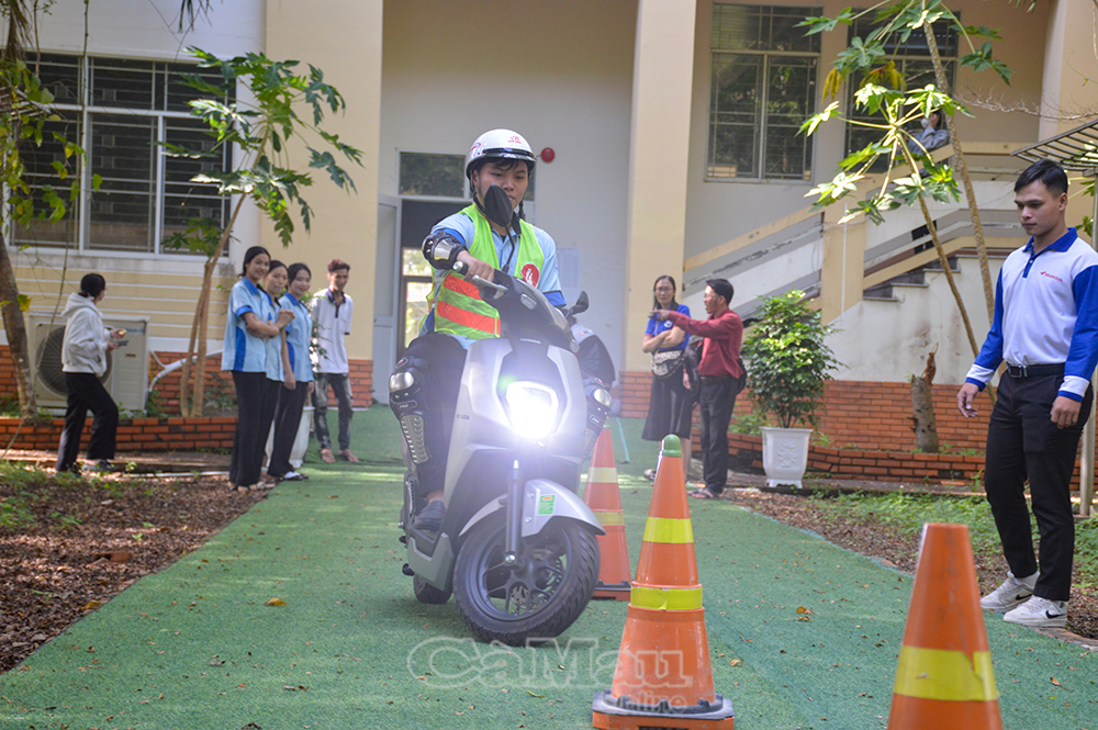 Kỹ năng điều khiển phương tiện được học sinh Trường THPT Cà Mau hưởng ứng, tham gia nhiệt tình.