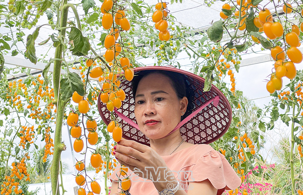 Chị Trần Phương Thảo chăm sóc những giàn cà chua cherry trĩu quả. Một hình ảnh đẹp về người nông dân thời đại mới bản lĩnh và sáng tạo.