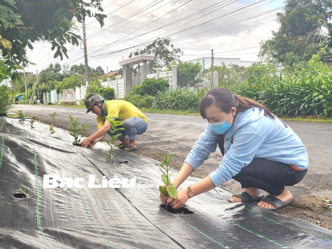 Cán bộ và người dân xã Hiệp Thành (TP. Bạc Liêu) trồng cây trên tuyến đường trải bạt.