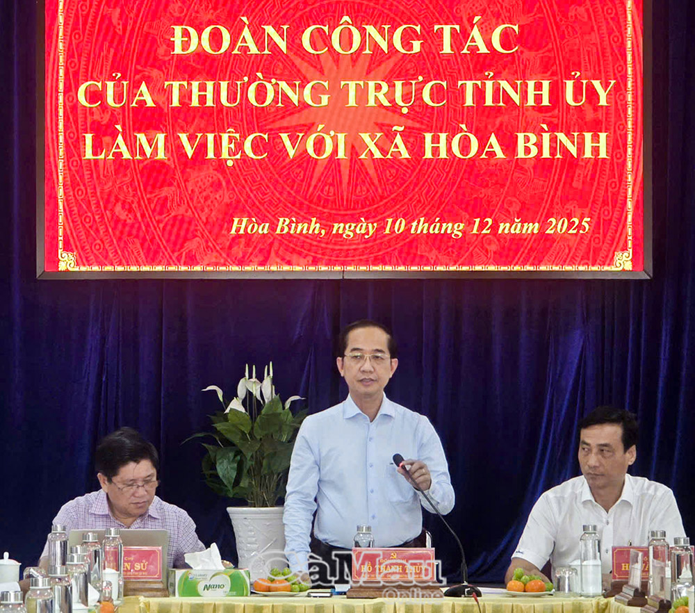 Báo Cà Mau Tại buổi làm việc với xã Hoà Bình sáng 10/12, Phó Bí thư Tỉnh uỷ, Chủ tịch Uỷ ban MTTQ Việt Nam tỉnh Cà Mau Hồ Thanh Thuỷ biểu dương những kết quả toàn diện của xã thời gian qua, nhất là việc đạt và vượt 17/18 chỉ tiêu chủ yếu trong năm; kinh tế tiếp tục tăng trưởng, bộ máy hệ thống chính trị vận hành ổn định, đoàn kết, thống nhất.