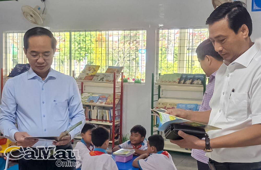 Phó Bí thư Tỉnh uỷ Hồ Thanh Thuỷ tham quan tiết học tại Thư viện thân thiện của các em học sinh lớp 4A5, Trường Tiểu học Hoà Bình A.