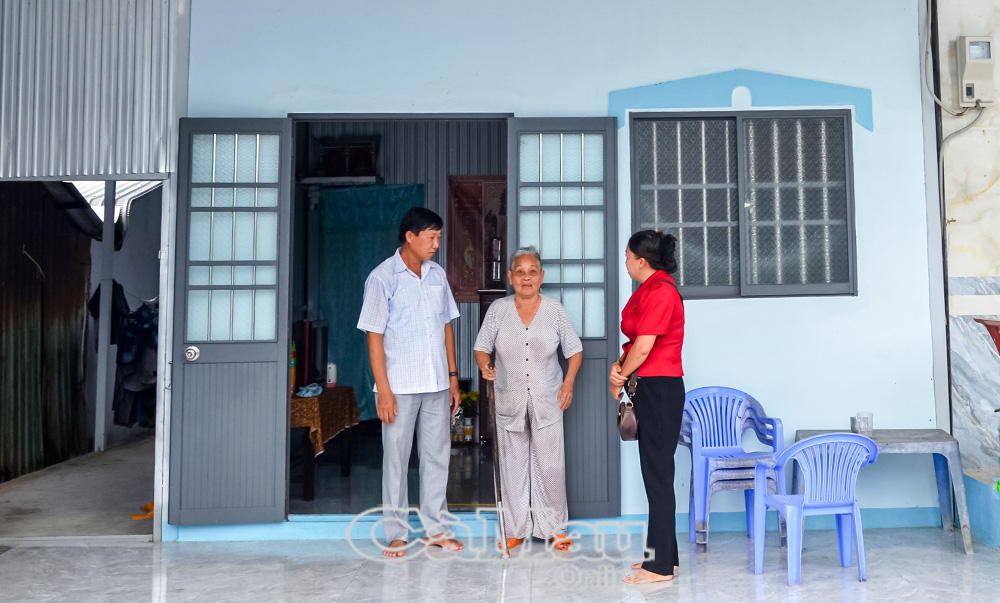 Tết này, bà Võ Thị Tuyền được sống trong ngôi nhà mới, không còn nỗi lo về nhà ở. (Trong ảnh: Chính quyền địa phương thăm hỏi đời sống gia đình bà Tuyền).