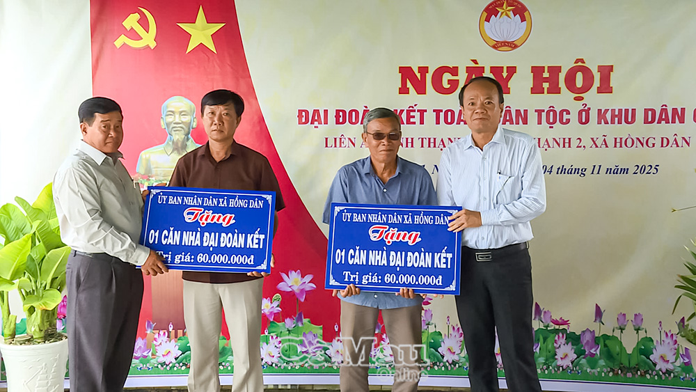 Ðồng chí Trương Sơn Tùng, Phó Bí thư Thường trực Ðảng uỷ xã (bìa trái) và ông Nguyễn Nhân Ðức, Chủ tịch UBND xã Hồng Dân trao bảng tượng trưng tặng nhà Ðại đoàn kết cho người dân khó khăn về nhà ở.