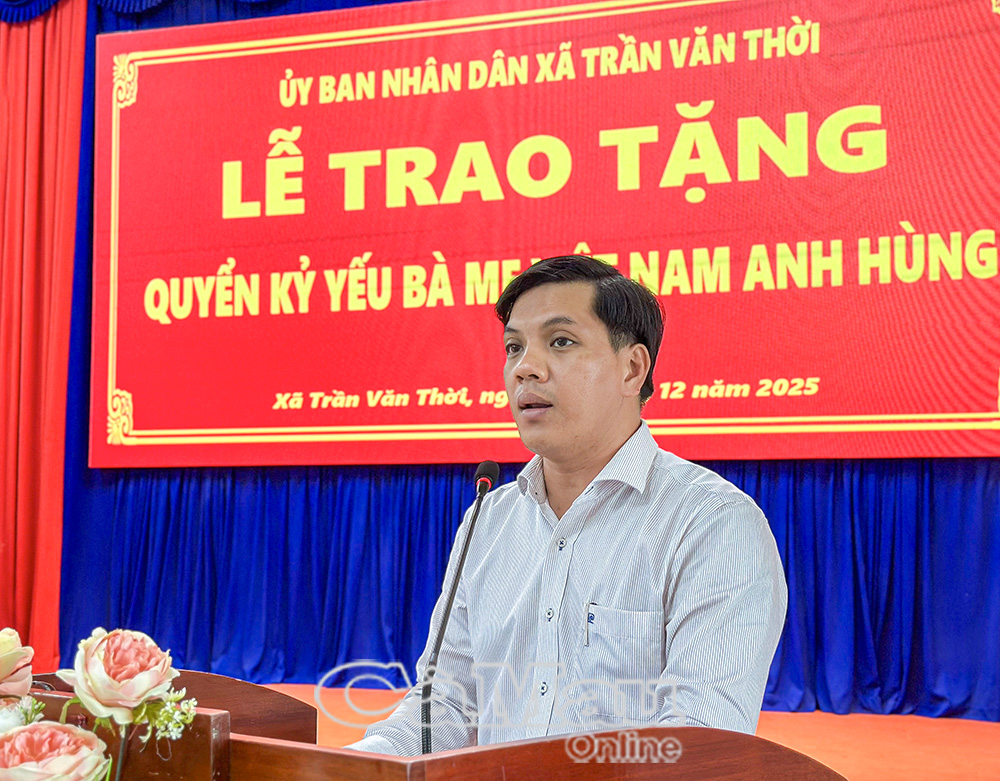 Phát biểu tại buổi lễ, đồng chí Trịnh Việt Khái, Phó Chủ tịch UBND Xã Trần Văn Thời, bày tỏ lòng biết ơn sâu sắc đối với các Bà Mẹ VNAH và thân nhân; đồng thời cảm ơn các cơ quan, đơn vị, cá nhân đã chung tay đóng góp để hoàn thành và trao tặng Quyển Kỷ yếu đầy ý nghĩa này.