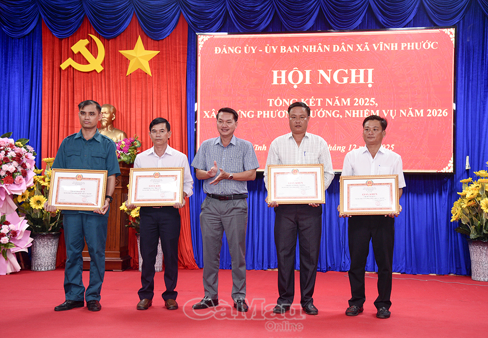 Đồng chí Trần Văn Liêm, Bí thư Đảng uỷ xã Vĩnh Phước, trao thưởng cho các tập thể, cá nhân có thành tích xuất sắc trong thực hiện nhiệm vụ năm 2025.