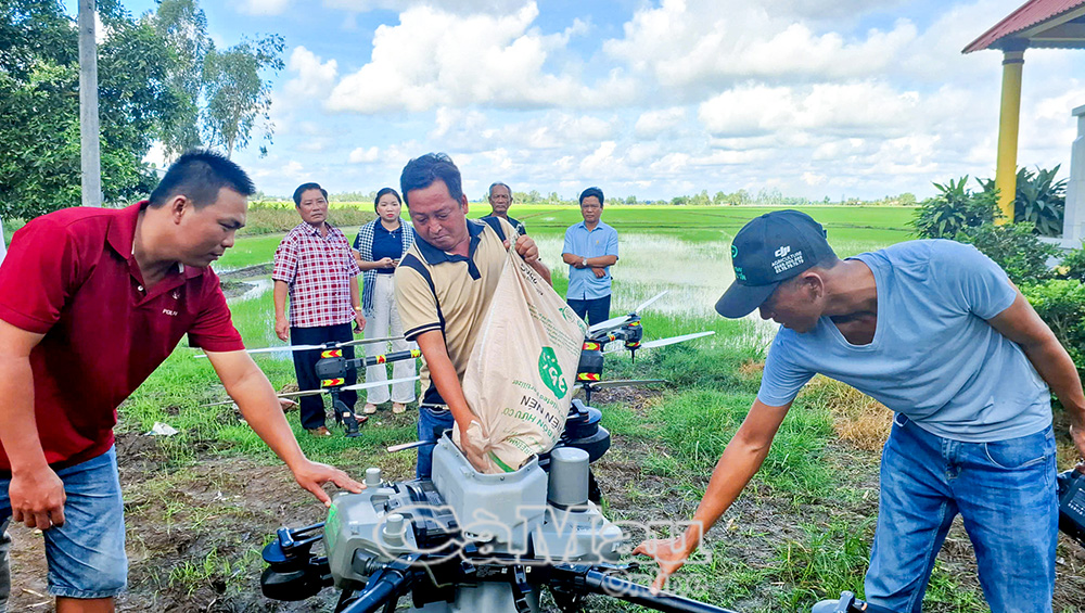 Nông dân sử dụng máy bay không người lái để bón phân hữu cơ.