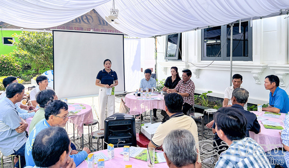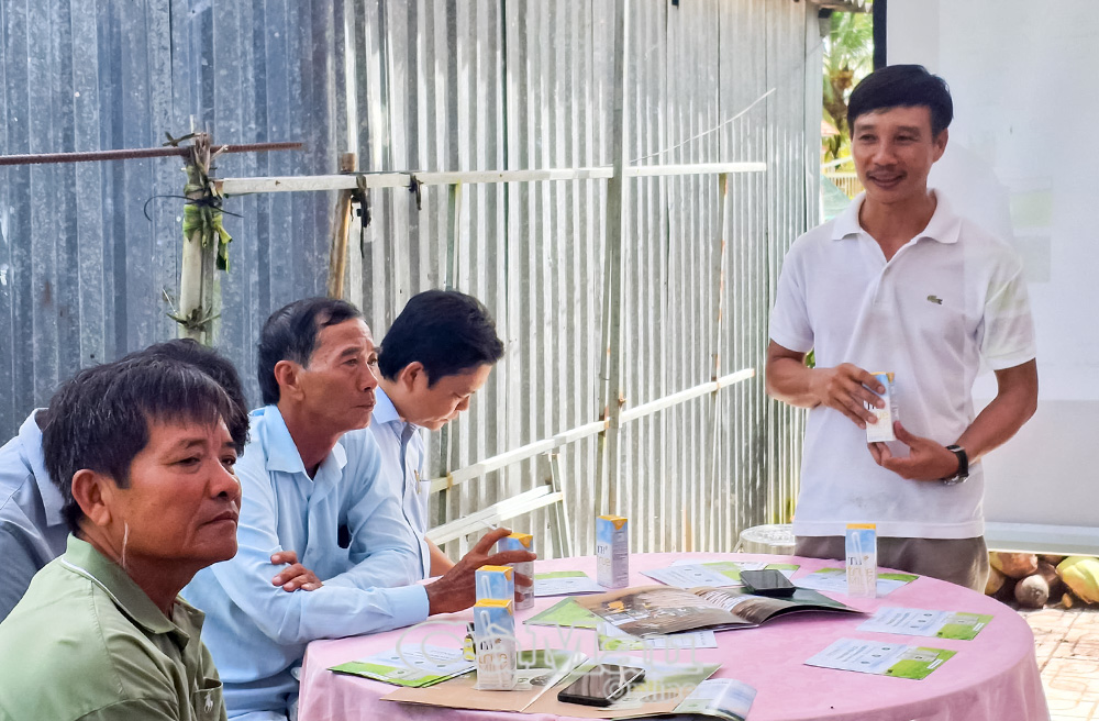 Doanh nghiệp và nông dân trao đổi về quy trình sử dụng phân hữu cơ.