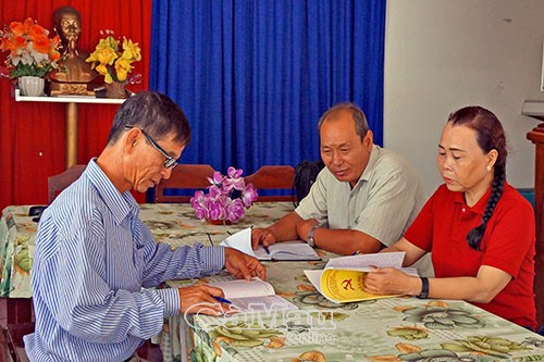 | Chi bộ ấp Tân Thành A, xã Tân Dân, huyện Đầm Dơi họp bình xét tập thể, cá nhân tiêu biểu ghi vào sổ vàng. |