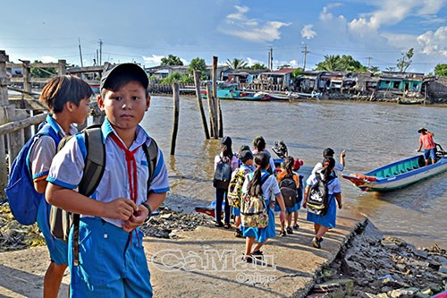 | Học sinh ấp nghèo vùng biển Lưu Hoa Thanh, xã Tân Thuận, huyện Đầm Dơi, đến trường trong điều kiện khó khăn. |