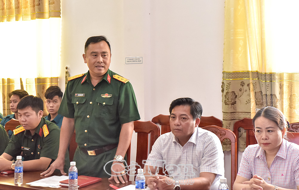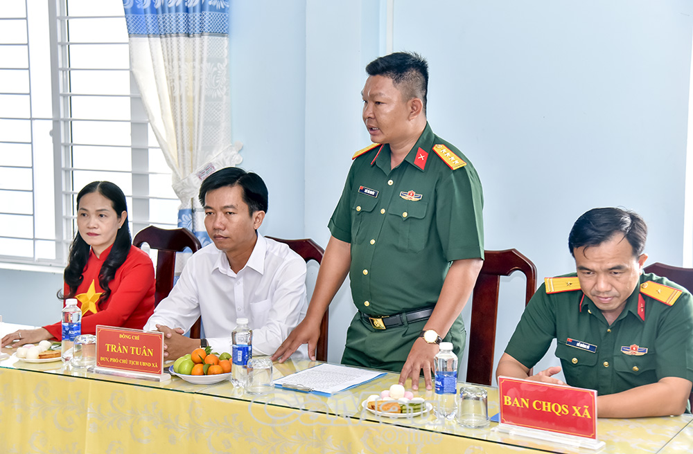 Trung tá Đặng Minh Đến, Chỉ huy trưởng Ban Chỉ huy Quân sự xã Tân Hưng, báo cáo tình hình hoạt động với đoàn.
