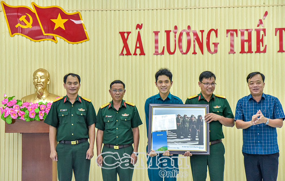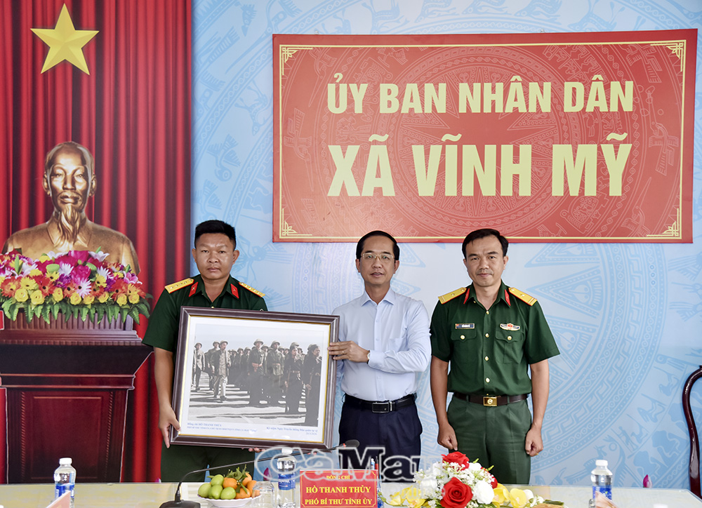 Đồng chí Hồ Thanh Thuỷ, Phó Bí thư Tỉnh uỷ, Chủ tịch Uỷ ban MTTQ Việt Nam tỉnh Cà Mau, trao tặng bức tranh “Bác Hồ với lực lượng Quân đội” cho Ban Chỉ huy Quân sự xã Vĩnh Mỹ.