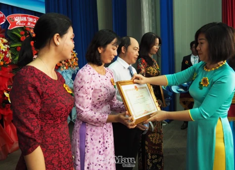 Tiến sĩ Nguyễn Hồng Nhung, Hiệu trưởng trường, thừa uỷ quyền trao Bằng khen của Chủ tịch UBND tỉnh cho các cá nhân hoàn thành xuất sắc nhiệm vụ công tác năm học 2022-2023.
