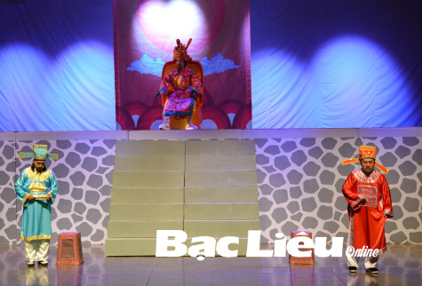 Đạo diễn Ngô Quốc Khánh - Phó Giám đốc Nhà hát Cao Văn Lầu (bìa phải) là người vừa sáng tác kịch bản, vừa tham gia biểu diễn các tuồng cải lương. Ảnh: H.T