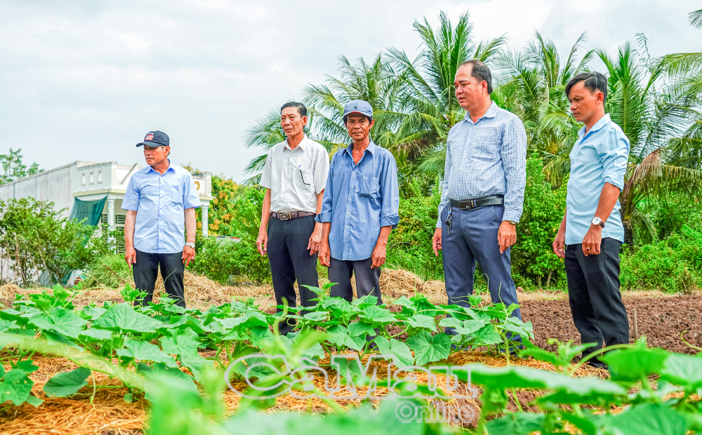 Vườn rau xanh mướt của hộ ông Phan Trà Oai (thứ ba từ phải sang), ấp Thành Thưởng A, phục vụ thị trường Tết.