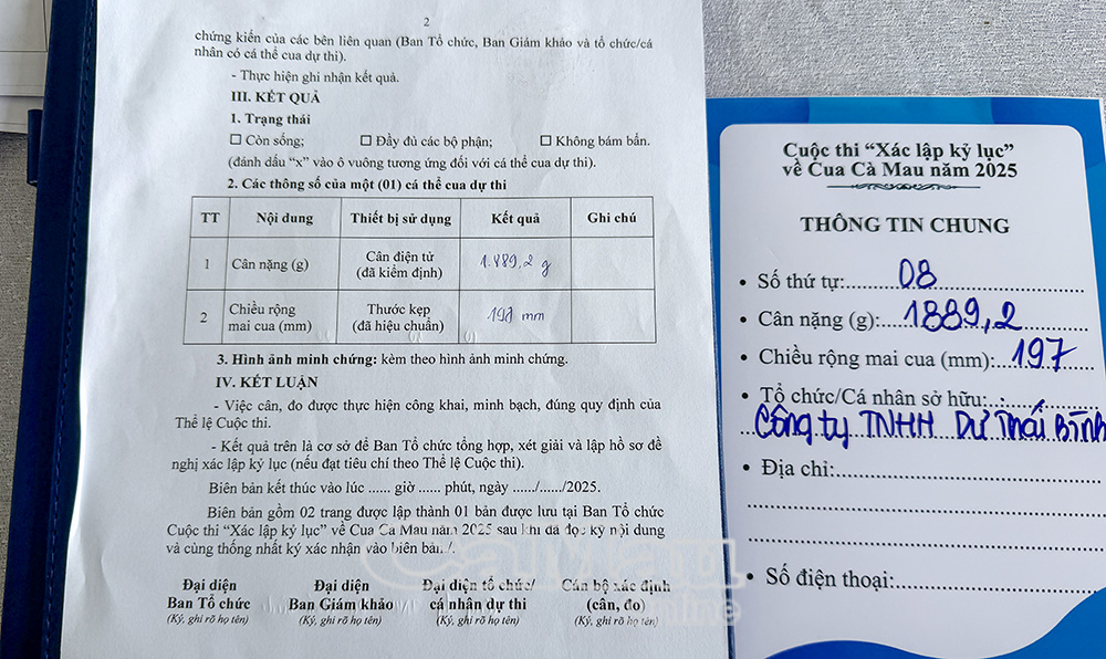 Ban tổ chức ghi nhận và lưu hồ sơ cá thể cua nặng gần 1,9kg.